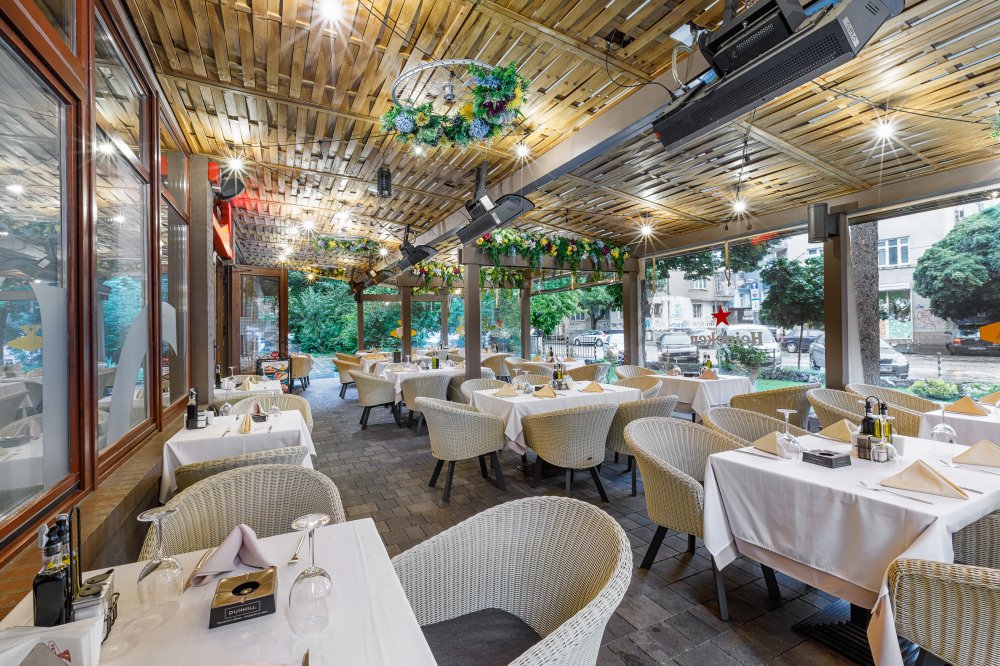 Ресторантът разполага с просторна и слънчева тераса, прохладна лятото и закрита и топла зимата, в която може да се насладите на любимите си ястия в приятна обстановка.